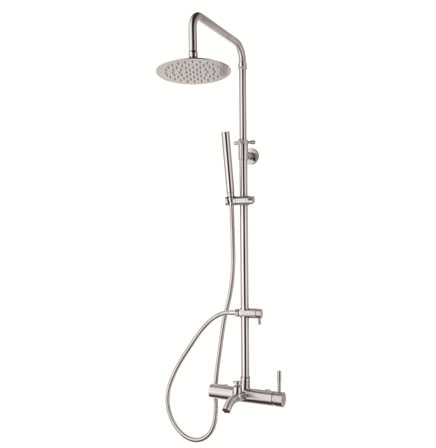 是由淋浴盘和手持花洒组成的,淋浴盘固定在头顶位置,且有万向球阀用来调节花洒盘的出水角度